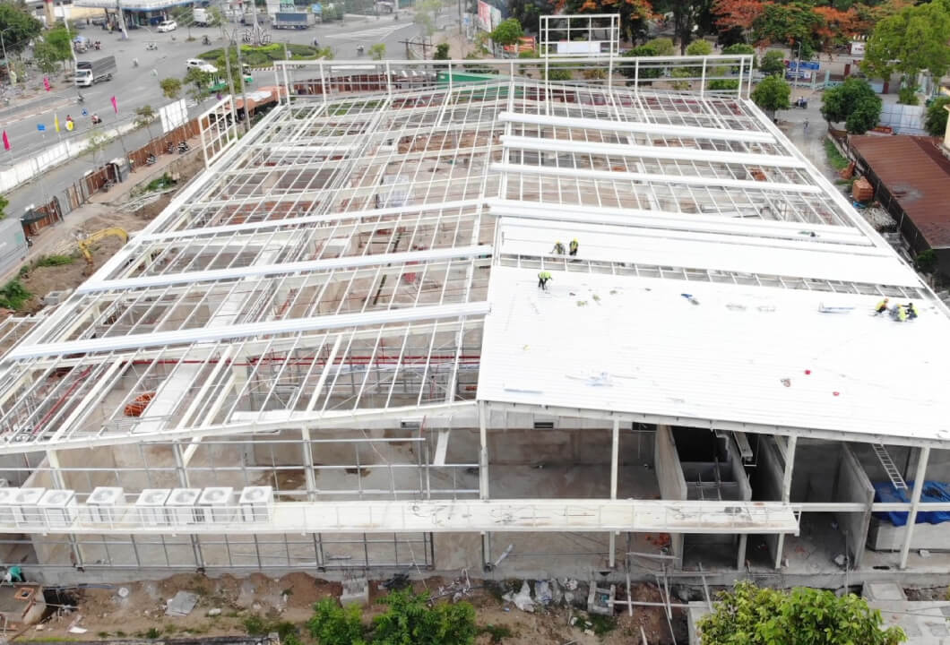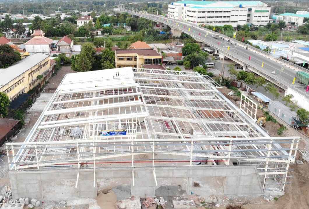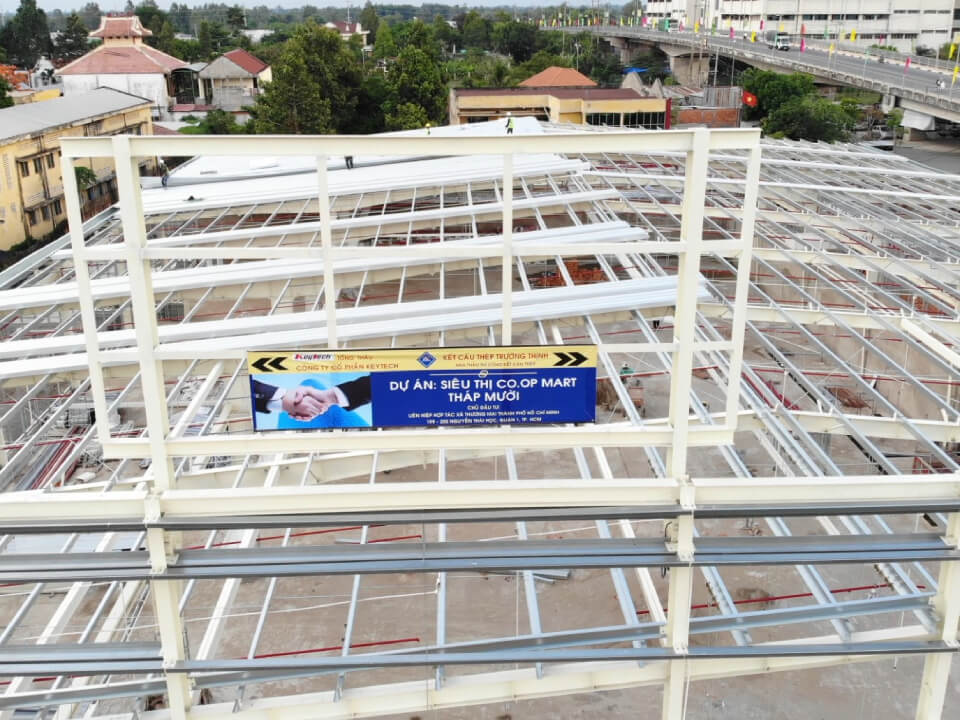 Co-op Mart Hong Ngu supermarket project in Dong Thap province, with a floor area of 3,000 m², parking area: 1,200 m², with the main structure being a steel house. The project includes many items, such as a yard and entrance, with a total investment of up to 62 billion VND, located in the Hong Ngu town building.
